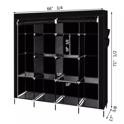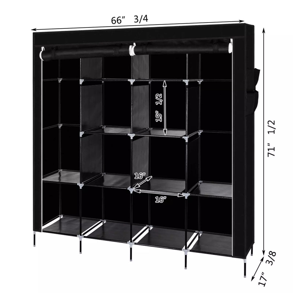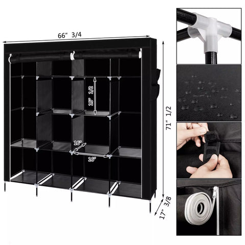Our 67" Portable Closet Storage Organiser Clothes Wardrobe is Made from Selected Non-Woven Fabric Cover, High Quality Steel Tube and PP Plastic Connectors, Which Will Durable and Meet Your Long Term Storage Needs. The Size for The Clothes Wardrobe Makes it Suitable for Organizing Your Small Rooms and Walk-In Closet. Movable Improved Clothes Hanging Rod and 12 Storage Shelves Offers You Enough Space Both for Your Longer Outfits and Folded Clothes. Zippered Dustproof Cover Offered to Keep Your Item Away from Dust and Water-Proof Fabric Tiers are Easy to Clean. It Will Be Great Convenient and Functional. Do Not Hesitate to Buy One!